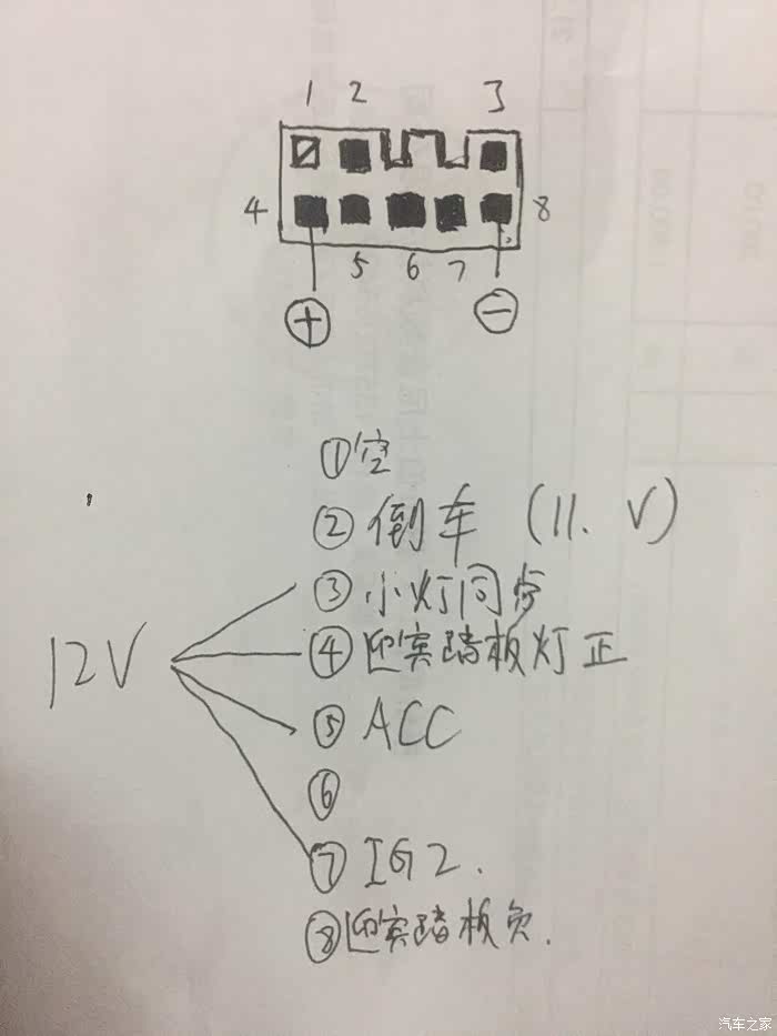 这张图才是重中之重,这是我用万用表一个个量出来的。可以看出来这个接口实际上作用多多,例如倒车同步有电,这个是给防炫目后视镜做倒车停用的信号,ACC和IG2不解释了,迎宾踏板灯需要说明一下,非常有意思,它的正极是常电,也就是说不按点火开关也有电,但是负极只在你拉开车门的时候才是搭铁,关门后由于继电器的作用会变成正极,所以千万不要乱用。小灯同步,这个是用来做车内氛围灯的,因为只有在晚上开灯后才有用嘛,需要说明的是,你们购买的那种马鞍条蓝色氛围灯取电是在点烟器的灯圈,但这种方式非常不科学,因为走的是仪表台灯光亮度调节通道,一旦出现问题难保你的杰德开起来成为睁眼瞎。还有一个6号针,没测试出来作用,但是可以肯定的是,不是点火后有电,就是有速度的时候才有电,作用嘛,用来做一个BSM盲区雷达的启动还是不错的。
