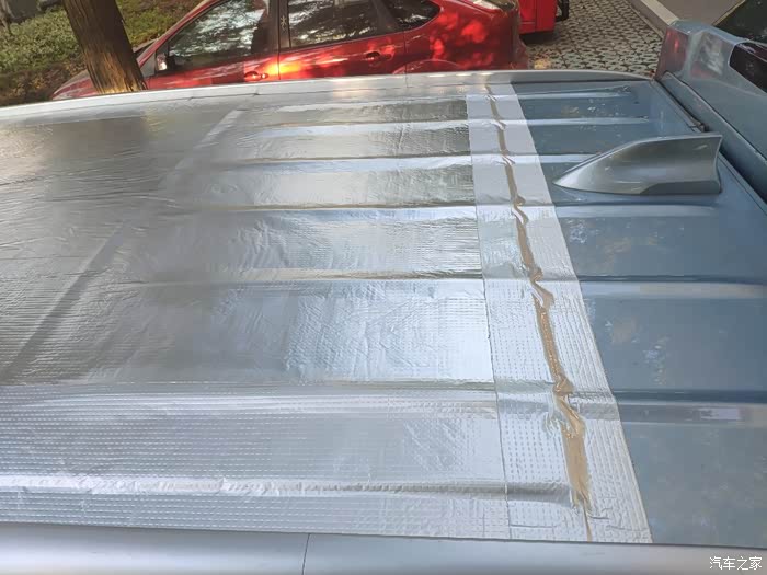 5mm隔热膜,丁基胶带封边。忙活了1、2个小时,搞定。因为车顶有弧度,所以没有铺得很平整,有褶皱的地方,应该对风阻影响不会太大