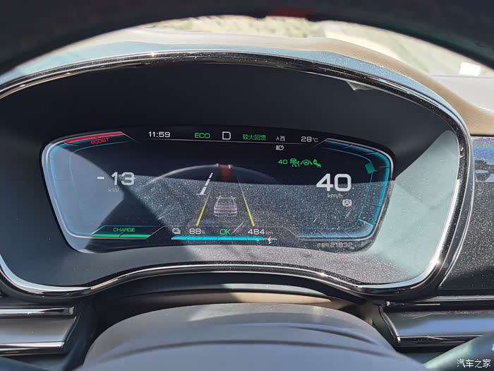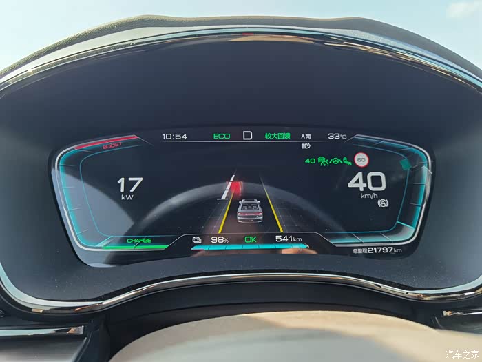 第一个垭口的海拔不高,差不多将近两千米上下,过了这个垭口,就开始长下坡,这是二十四公里的长下坡,这对于纯电动车来说,这真的是一个最好的状态,主要是因为纯电动车下坡能发电,其他的燃油车辆做不到动能回收,下坡不踩刹车,刹车片不升温,还能发电的现在只有绝大部分新能源能做得到。