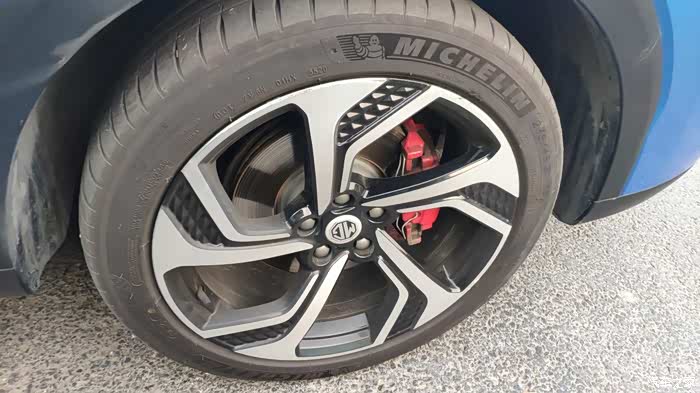 刀锋式的轮毂造型超帅,红色的刹车卡钳看起来很运动,最值得夸的其实是这个轮胎,米其林轮胎的静谧性真的不错,抓地力也好