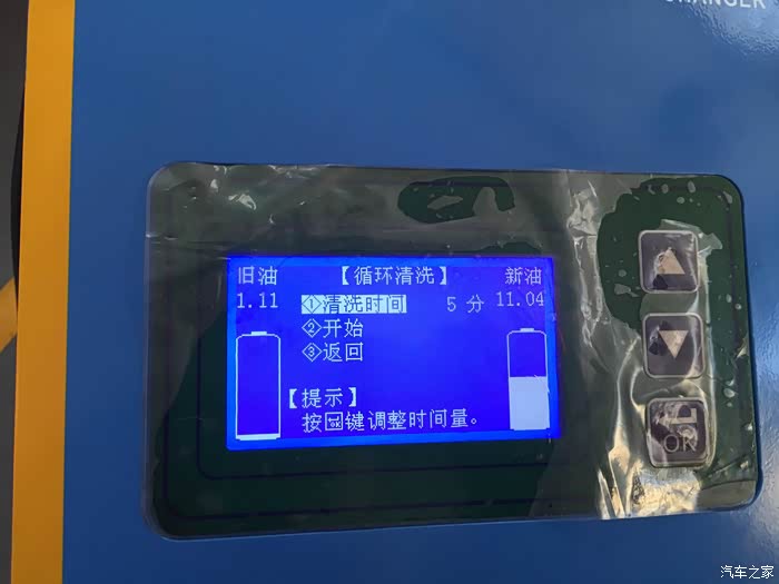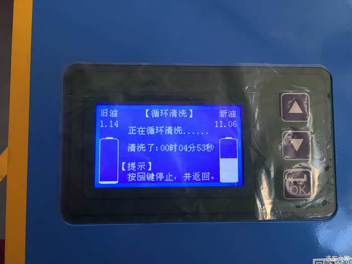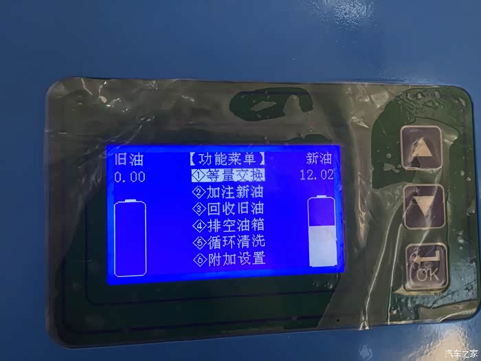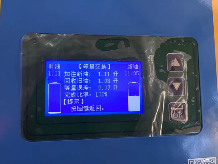 爱信全自动循环机换油机左方显示屏有数字油量显示,下方新油处为本次注入新油的显示:(因人工加油,存在一点小差距,但不影响换油效果)