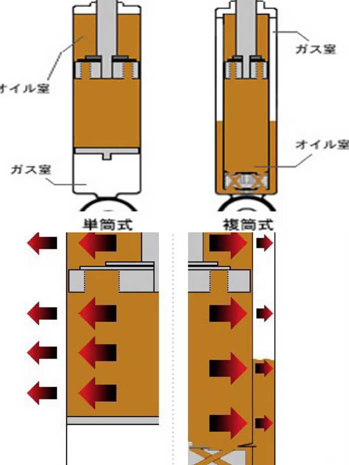 气压避震器(Mono Tube):顾名思义是单筒身的设计,内部灌入高压氮气储存于本体下端的气室,以自由活塞分离油与气体。此型避震器有反应较快、构造简单、散热容易等优点。单筒式避震器其在回拉伸长行程及压缩行程全部仰赖活塞阀体产生阻尼,而气室在本体下端,以自由活塞分离油与汽体(油、气分离式),在伸长行程时,活塞上室产生压力,油经阀体往下室压缩时则相反,封入气室内的氮气在缩短行程时,成为活塞上室不成负压的够高值,也就是,在油还没有全流到上室时,气室抵消了不平稳的压力,故此型避震器会有好的路面表现,另外其气室和液压油室完全分离,在高压的状况下,不会有空穴的现象产生,所以在严苛的使用环境之下,仍可发挥高水平的稳定性能,另外油封因作动时直接受力于活塞上室之压力,需要高度的耐压且须特别注意的因其加工需要高精密度细腻度,故一般避震器生产商难以生产耐用性与稳定性高的单筒式避震器。