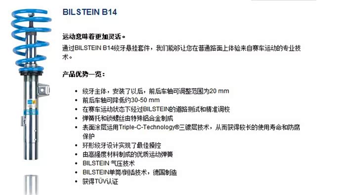 BILSTEIN B14是在B2系列之后的第一款绞牙避震,B14做为入门级绞牙避震套件,只能调整车身高低、但不能进行阻尼调教,主要面向从运动避震套装或者运动弹簧升级或者对车身离地距离有特殊要求的朋友。