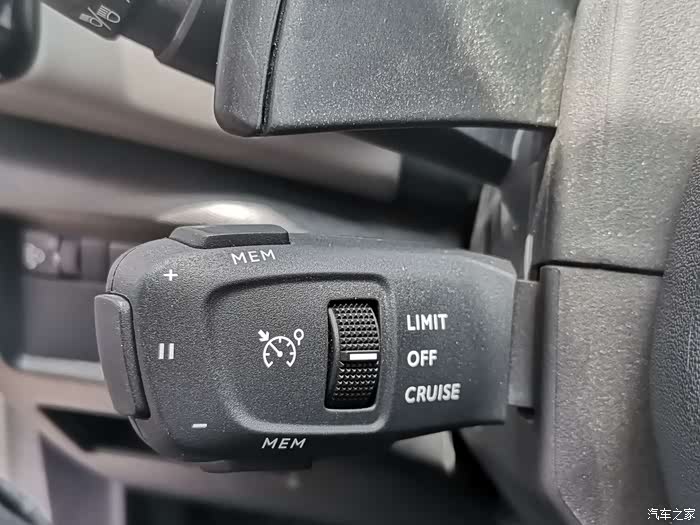 另外一个定速巡航功能,它的操作杆比较隐蔽,在方向盘的后面,上面有个拨轮,往上打就是限速,往下打就是定速,中间位置就是关闭。手柄的标有加减号的就是速度加减。