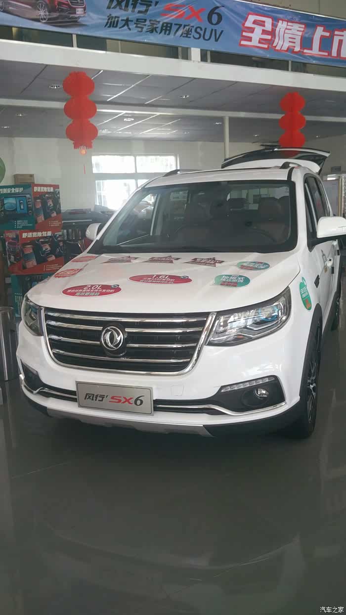 自从积极响应了国家二胎政策的号召,一大人家出行就成了问题,通过大家商量,决定买个7座车。刚开始看见宝骏730的广告:7座家用车,223座椅布局,进出方便,价格也能承受,觉得还不错。后来无意中看到风行SX6的广告了,同样是7座223,还是SUV,高离地间隙,高通过性,关键是外观霸气侧漏,就一眼相中。后来就天天逛论坛,关注小6,从实车到店,到7月24上市,先后4次到4S店看车,最后果断订车。经过了两个月的漫长等待,终于可以提走我的爱车小6了。