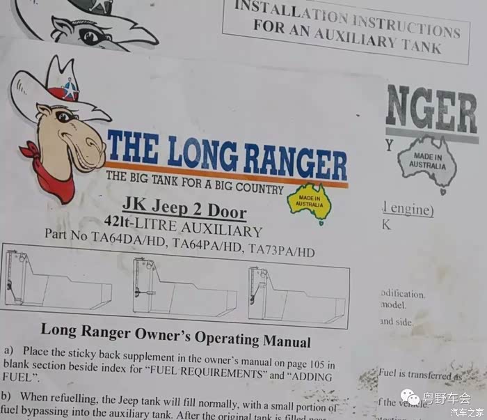 千里之行始于轮下,千里马遇上伯乐能配到好蹄,今天向大家简要的介绍牧马人最实用的改装之一,让你的爱车可以变成千里马,可以无所顾忌的穿越无人区,长途自驾游,走西藏;避免油桶带来的众多不便,以及遇到不靠谱的油站加到低质量的和高价汽油。减少因为半路没油无法前行的烦恼和尴尬。 安装副油箱一直面对安全隐患和影响越野能力(减小最大离地间隙),副油箱与排气管和传动轴的安全距离,隔温技术的使用。在jeep兄弟的努力下,用牧马人专用的副油箱,隔离、隔温材料和组件安装和使用。原车主油箱70L,装上澳洲进口THE LONG RANGER牧马人专用副油箱两门42L底部6mm,如果按百公里油耗11.2L计算,牧马人俨然成了千里马。