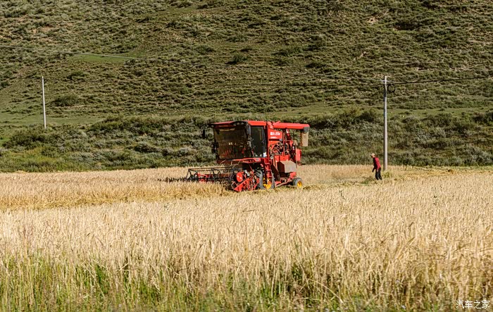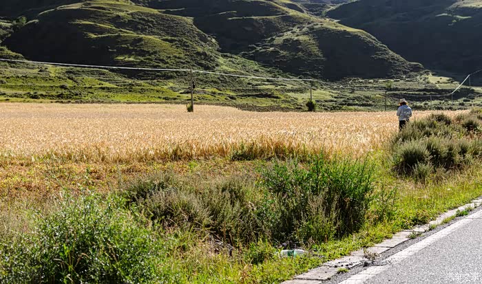 金浪翻滚的农田与紫红色狼毒花交错,偶有土拨鼠从草甸探头张望。