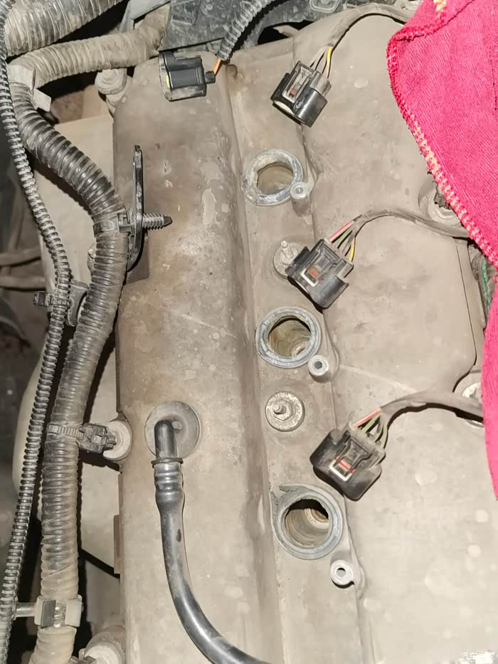 可能前任车主真的开的少吧。不解的是:装点火线圈的孔边也这幅模样!万伏电流给打坏的?后来用胶修复一下,不会漏进水就行