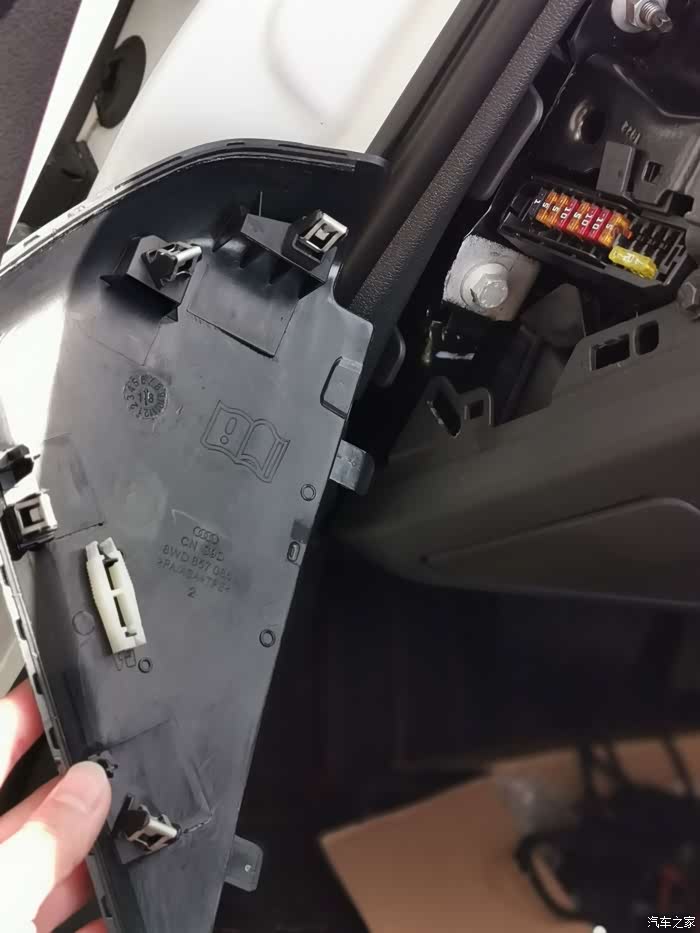 此处就是A柱,需要很用力扣。上面有气囊。大家用工具的时候,需要注意下,别乱来。扣下后,仪表台左边喇叭撬即可,不过比较紧,慢慢来.