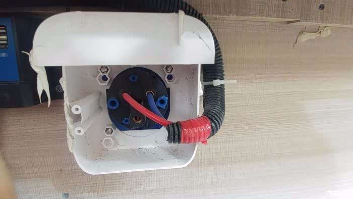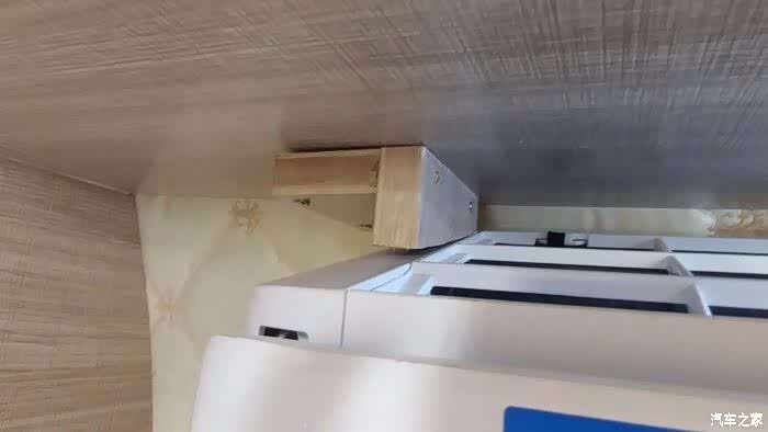 再来看看咱家定的新款房车(白色),空调铜管和滴水管走线现在已经从车体右后边底部出来连接到外机,管子在房车里面也锲入房车龙骨框架内部并钉入内墙,不再像老款(蓝色)那样管子露在车体外,为厂里这个巨大的改进点赞,清爽多了!