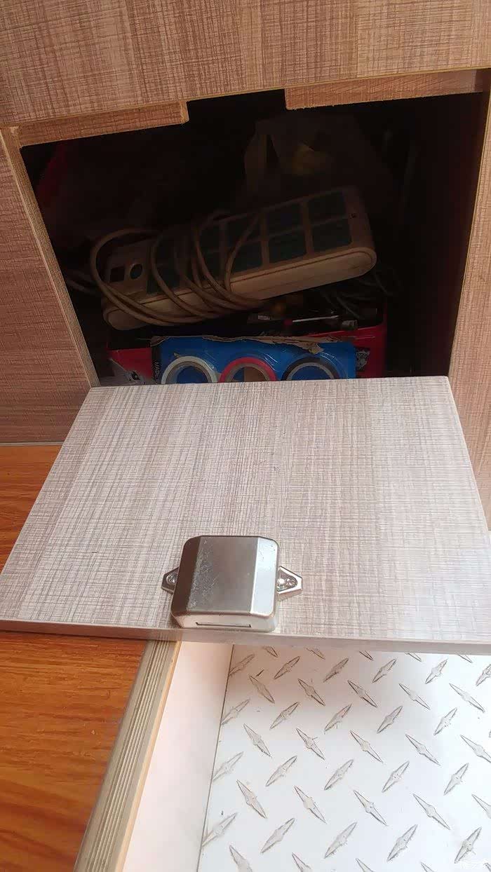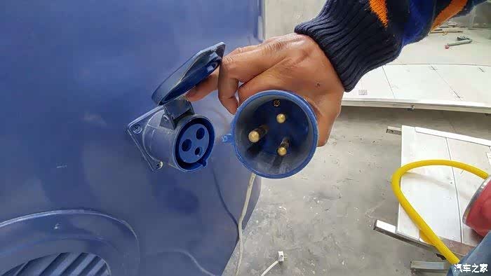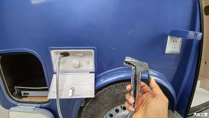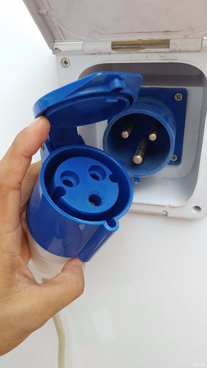 这张图片是以前老款房车(蓝色)的220v外接电源盒,可以看到盒子有明显突出来的部分,这部分很容易和其他车辆在会车时发生刮蹭