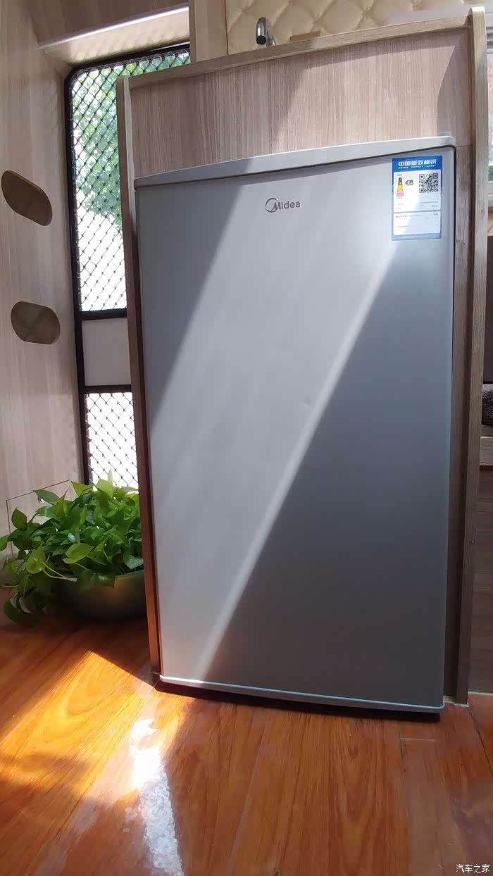 结合房车内洗手池下边的储物空间尺寸,我们选配了这款220v的美的93升小型单冷式冰箱