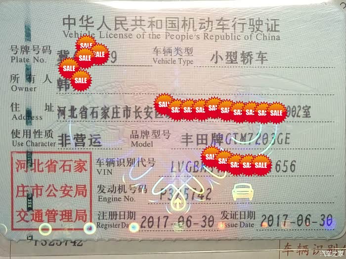 6月21号跑到锐源店,谈价格,交订(定)金,看车;约定6月底前提车,因为事多拖到6月30号才去提,有人问是为了庆祝香港回归还是党的生日,其实我也没搞清。提车时原来的销售闹情绪辞职了(世界变化真快),新换了一个代理,因为人家有自己的客户提汉兰达,忙的焦头烂额还出了点差错,基本上顾不上我,最后在下午5:30终于办完所有手续,开始拍号,50选一180秒,用了大概30秒随意挑了一个339中间还有两个字母的号牌,打印行车证和汽车所有权证等,打完6点整,交警下班。在提车没验车的情况下用了10个小时,最后办完所有手续共花费18.05万元(误差小于100元)(5万丰田金融,免息免费+30万第三者),比预想贵了一点。