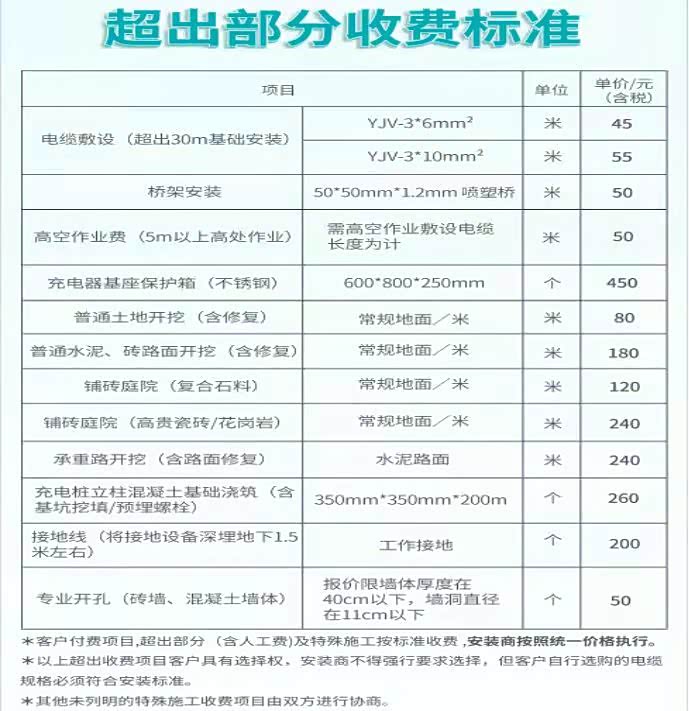 小Y领回家后就马上报装新能源表和充电桩了,新能源电表报装我是到当地供电营业厅办理的,准备了4s店提供的充电桩出厂检验报告、合格证、和户主身份证复印件和银行卡,因为我充电场所不是小区,所以不用物业许可。然后就等师傅过来安装电表了,大概三四天供电师傅就过来安装好新能源表,同时就在埃安app私桩报装上申请报装。安装师傅马上联系加了微信,发给我安装电桩超出部分的明细费用表(下图)