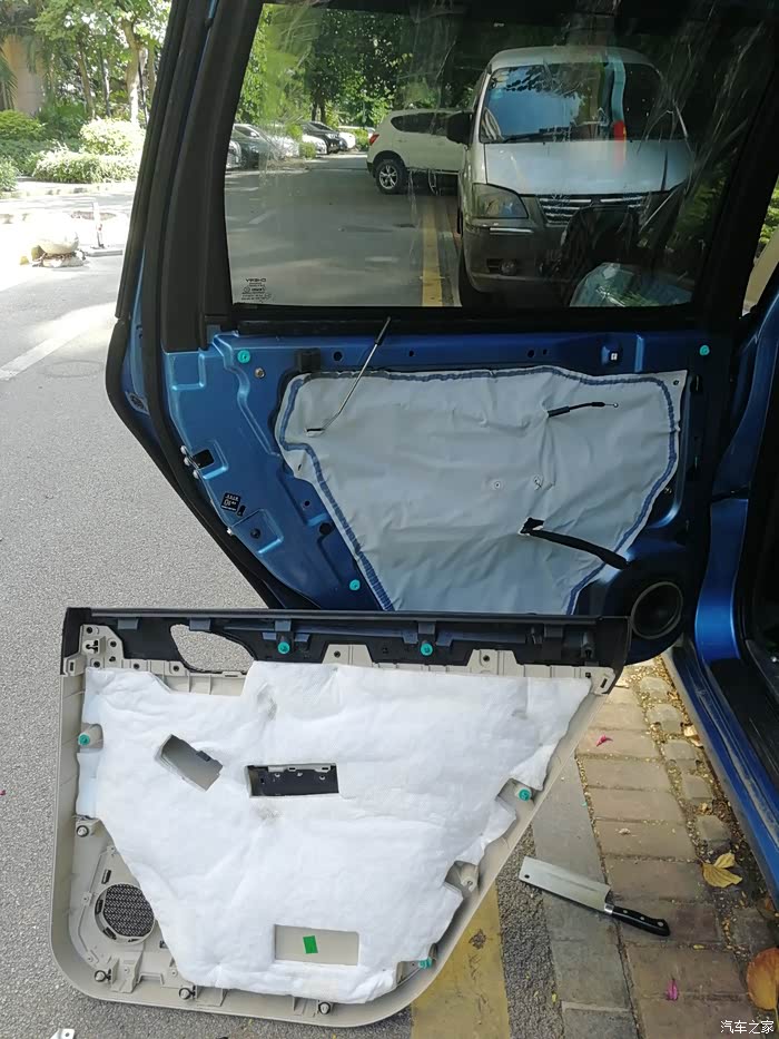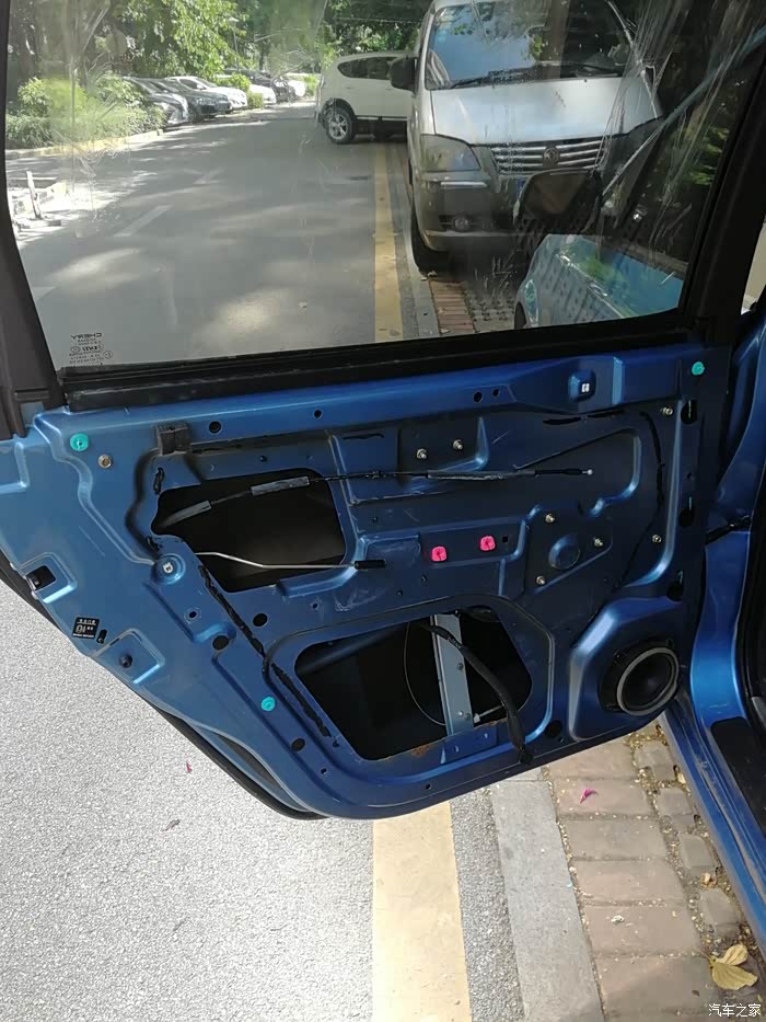 周末休息,开始动手。先是拆门板。门板的螺丝,前门与后门有区别,前门有三处螺丝,分别在门开关、门拉手、门反光灯,后门只有二处,没有门反光灯。卸完螺丝后,门板不会自己松开,因为有很多卡子将其与门固定,需要撬开。口子从门板最下面边缘开始,用卡子撬棍或者菜刀从下面插入,一用力就可以撬开,后用适当力度,将各个卡子掰开,门板即可下来。这个环节是大力出效果,不用担心卡子坏,因为,网上买升降器,都送有足够的卡子,坏了更换即可。