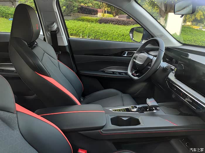 全车采用橙黑撞色内饰,前排是赛车一体式运动座椅,支撑力强;后排空间宽敞,座椅超级舒适。