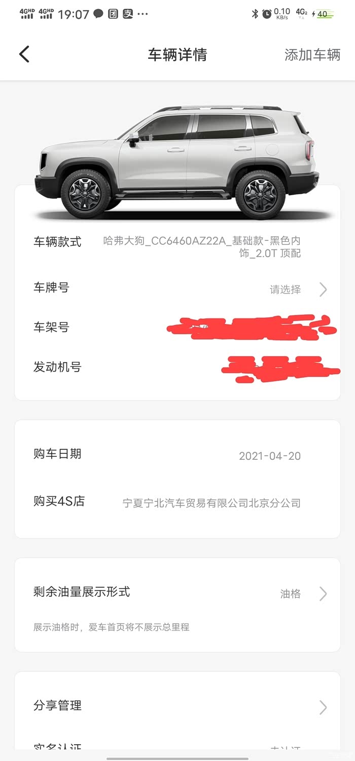 ,然后还告诉我名下有车可以增购再-2000,等于优惠5000,选配的钱大多数都回来了,于是我继续等,等到4月初,我们小区有辆黑色和白色的大狗天天在眼前晃,晃的人烦躁,最后看到一篇帖子说大狗出了最顶配的车型,哎,我是从1.5t硬硬熬了快4个月,把2.0t顶配藏獒(那会儿都这么叫,还没定名哮天)都给熬出来了,看了藏獒的配置,我选配的东西除了方向盘加热,其他都有,还是2.0的,带2把锁,4个at胎,我瞬间就心动了,开始各种打听藏獒的消息,基本我们城市和周边省份的4儿子电话我都打了,有的4儿子都没听过2.0t还有顶配,都没有,最后往远打听,确定北京有现车可以提,那么接下来就是找4儿子退定金,这退定金就不讲了,讲又是一篇作文了,最后磨着反正是退了,在4月12号给北京交了定金,他们说白色就有现车,2辆,立马能提,我觉得大狗和白色不搭,我一直就没看上白色(哎,可事不与人愿,最后还是提了白)就没同意,我说要黑色或者灰色,销售说黑色没有,灰色过几天可能到一辆,让我等着,说4月20号左右就能到,结果18号早晨给我打电话说灰色到了,我忙工作没时间,只能等19号下午下班定晚上机票过去,下了飞机打车到4儿子旁边订的酒店,第二天一早进去就开始问销售我灰大狗呢?销售领我去库里看,灰色第一眼就是有质感,低调,耐看,我说我想上去听听燕飞利仕的音响咋样(我对车的音响不是发烧友,但还是有那么一丝丝要求的)销售当时有点儿懵圈,说,哥,这是田园犬,没燕飞利仕,我也被他弄懵圈了,俩人互相看着发愣,我说你看微信聊天记录,我定的是2.0t顶配,不是高配,是藏獒,不是田园