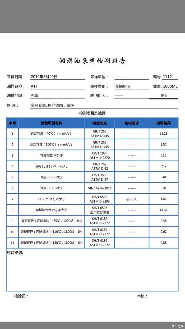,继续ATF的检测,今天发3款油的检测报告,分别是采埃孚ZF AG6(通用车型)、ZF AF6(福特车型)和宝马原厂新款壳牌ATF。三款油都是1升装未开封,本次检测只对送检样品负责,样品由群车油提供。