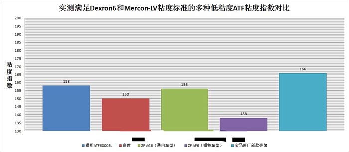 粘度指数对比,在满足dexron6的前提下,粘度指数越高,冷启动时顿挫越小,冷启动时和变速箱油温较低时的抗磨损保护越好。