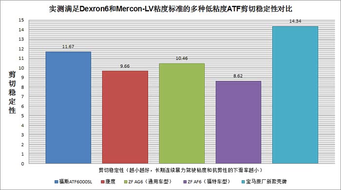 8.剪切稳定性通用10.46,福特8.62,宝马14.34,高温高负荷下机油的粘度保持能力,数值越小粘度保持能力越优秀,此项指标宝马原厂最差,af6比较好,ag6也比较一般。 在满足德士龙6标准(粘度6.4以内)的变速箱油里,如果剪切稳定性数值很低,且粘度指数数值很高,可以肯定的是全合成(PAO或者酯类)基础油的含量非常高,而且用了相对更高端更优秀的粘指剂。