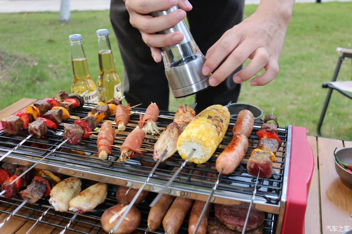 我们也是带了不少食材,用车的外放电源把电烤盘插上电,直接来了一顿烧烤。我发现了在户外吃啥都更香,环境不一样,心情果然不一样。