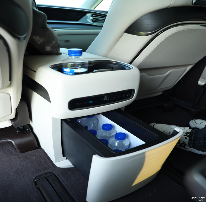 车内更是贴心地配置了车载冰箱,这大热天的能在户外喝上冰镇水和饮料也是很享受了。而且冰箱的容量也不小,放七八瓶水还是没问题的,户外露营或者长途出行很实用。