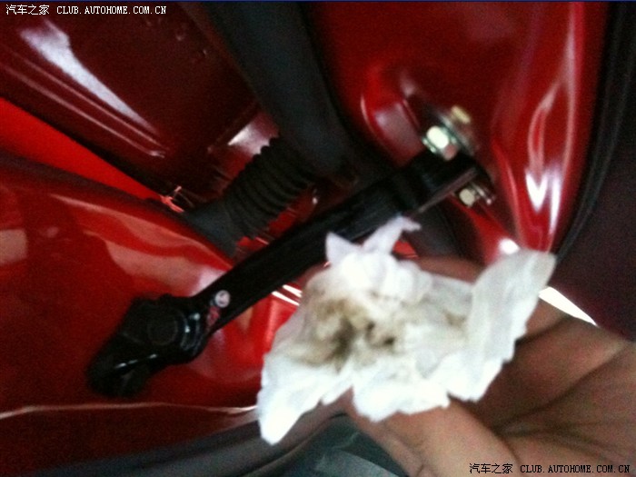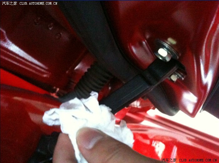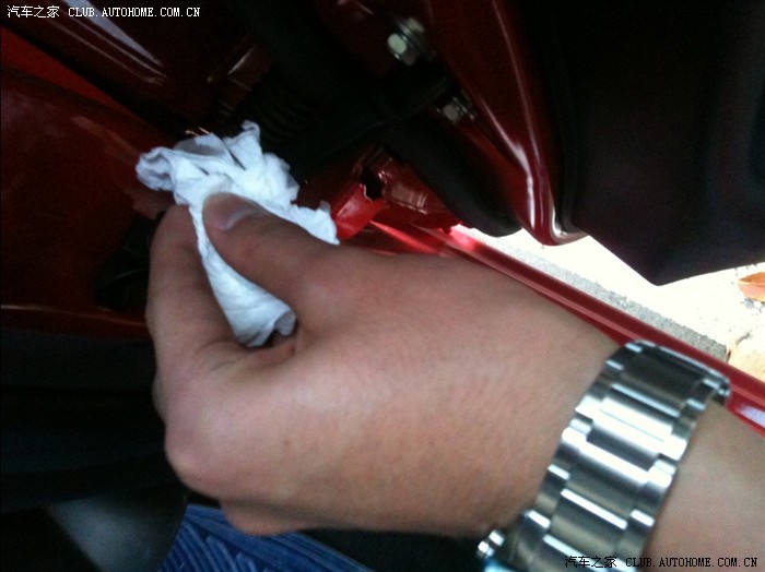 下车时开车门总觉得这个车门越用越生涩,难受呀!发现原来是里面那个小黑条子上没有油了。从4S带回来的机油派上了用场。