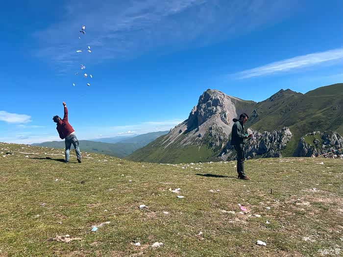 两个藏族车友在垭口抛撒龙达,一边撒一边念祈福语,随着一声高喊哟呵,龙达被整卷抛向空中,下落过程中,风将龙达吹散开