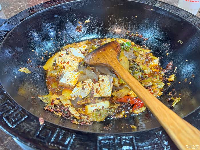 汶川的酸菜鱼,先将佐料炒熟,然后加汤,再将鱼放进去,都是当面制作,很有特色