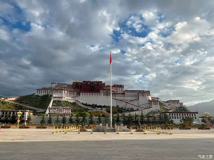 清晨的布达拉宫,蓝天白云,风和日丽,阳光洒向大地,国旗尤为醒目