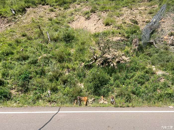 滇金丝猴,猴哥们胆子挺大的,看见我家猫咪吓退几步,马上发出警告声,心想我的娘啊,这车里怎么还藏着一只小老虎