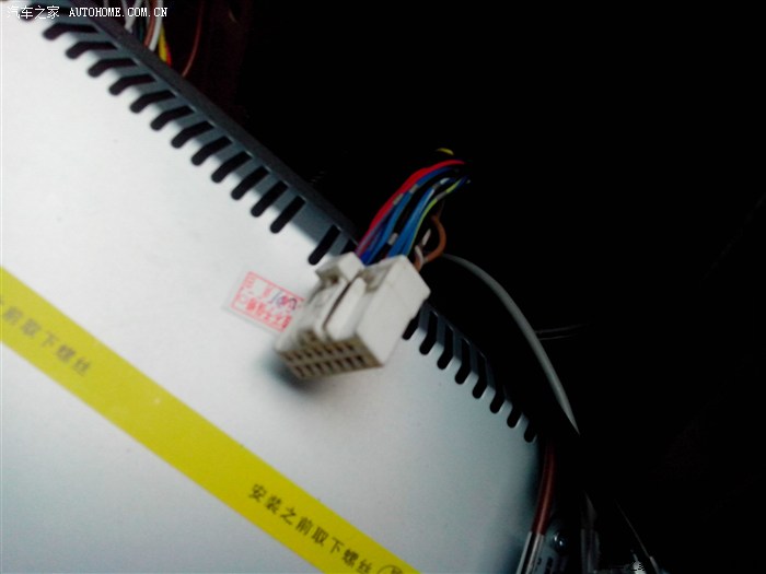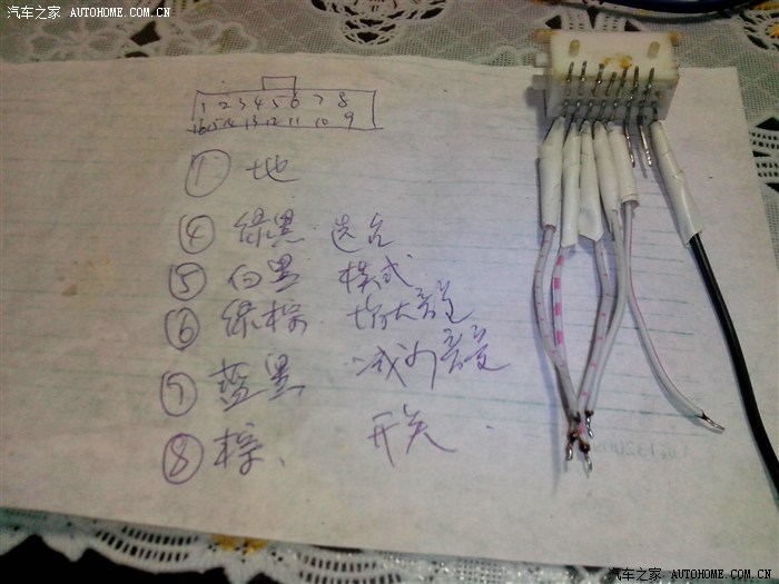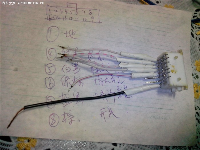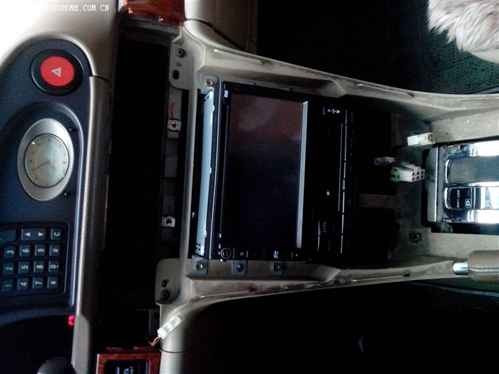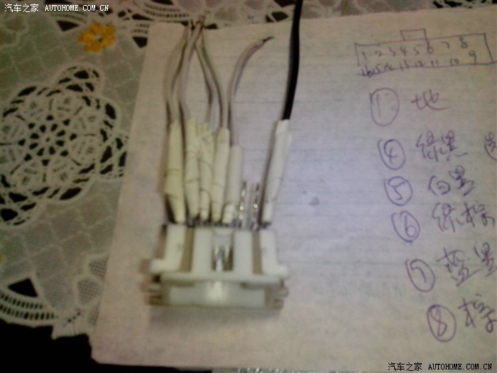 地点石家庄,时间,2013年2月春节前腊月二十四,天上飘着鹅毛大雪,由于送孩子考试,孩子进考场后我也闲来无事,按照师傅拆的顺序拆开了中控台,自己之前也看了网上拆的有关帖子,拆开它很顺利,拆下导航,检查尾线,对照之前下载的线路图和接口图,发现有好几根线师傅都给接错了,导航的功放控制接到了原插头的天线控制上,小灯检测线接空了,反复看图纸,接口图上没有小灯线,反复排查,终于发现了原插头第九端口还有一根线,是粉色的,跟大灯自动开启上的检测线是相同的颜色,于是将导航上的小灯检测线接到了第九端口上,调试,终于成功了,橘黄色的夜灯甚是好看,不由充满了成就感。但是,收音机天线控制线没敢接,因为天线已经接上了,原来认为收音机天线控制线是控制拉杆天线用的,就没有接上。