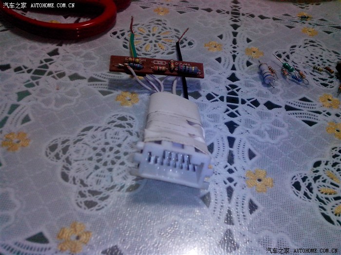 蓝鸟论坛网上发帖许久,终于有一鸟友角落男孩回复说他分别在每根信号线上串联了一个电阻,然后并联起来形成一根信号线,就行了,在此表示感谢。于是,年后又买了万用表,从不用的电路板上查下了30多个电阻,一一测量,最终确定了五个电阻,阻值分别为199欧、990欧、1.9k、4.66k、9.95k,焊接到一个方形电路板上,由于不想破线,又将原vcd屏主机线路板上的一个插座焊了下来(以前是电子爱好者,有电烙铁,现在很多年不玩了),按照接线图接上,胶布包好,实现对插,满心欢喜地回到车上测试,结果只能识别三个,而且还有一个不用按按键就能认出来,音量加减没反应,郁闷中。。。。。。。。。