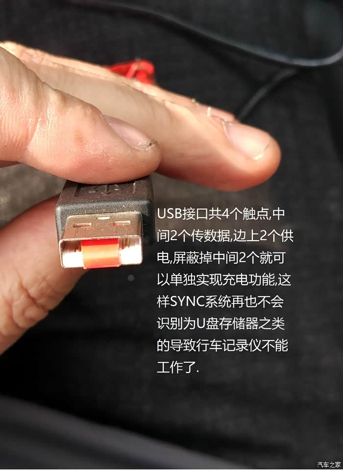 后来想起了之所以记录仪不能工作就是因为微软这个SYNC傻子系统,系统把我们的行车记录仪当成高大上的设备了.可以我们插上面仅仅是要取个电啊.立马联系同学,他搞电子的,问了下USB接口定义.哈哈.4个口中间2个是数据,边上是充电的.ok.掏出透明胶带.把中间2个封上绝缘.再次插上----工作-----熄火-----延迟30秒后关闭.成功