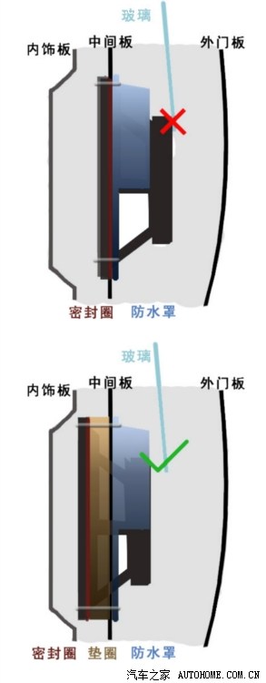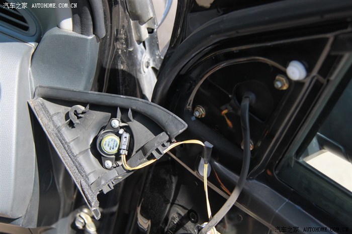 然后又开始挠头,高音的选位,高音比原厂的大,在原厂位不好安装,考虑到高音的指向性,还是安装在外面比较好,声音能出来,而且这样安装角度可以调整,这个位置也不碍事,用了一个螺丝固定住。总算结束了右前门的安装。