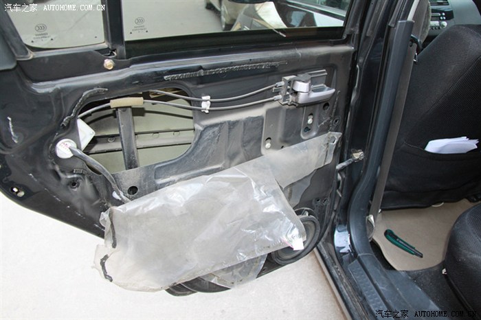下一步,按照原车拆下的那层塑料纸的形状,裁好止震板,粘中间层。注意事项,去掉车门上残留的胶,量好位置,把升降开关的排线和门把手那固定螺丝的地方开好口。