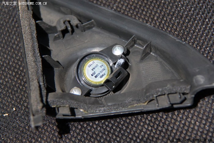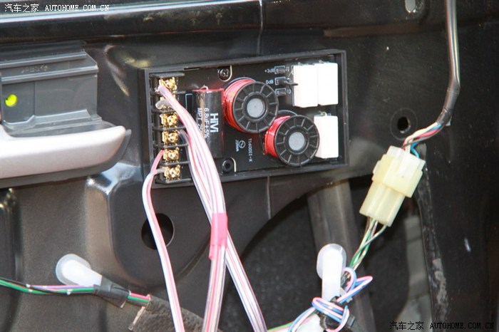 3、关于分频器和高音选位。仁者见仁智者见智,我觉得我找的地方一定不是最好的,有更好的地方以后会继续改进的,大家可以帮提点意见,呵呵。在前门里,分频器可以放的最大的空间就是在门扶手那了,但是考虑到电子元件怕震动,越靠外,关门时震动越大,所以尽量的往靠近门轴线的位置安。怕粘块贴不牢所以找有孔可以固定螺丝的地方,这样可选的位置就不多了。关于高音:高音的指向性很强,选位对高音的效果影响很大,这个位置的效果只能说将就,也没有精力去做A柱倒模,不过在测试的时候,把高音放在A柱与耳朵平行的位置效果最好,怎奈咱是DIY技术实力有限,上A柱的话涉及走线的问题,唉先将就吧,慢慢再想办法。