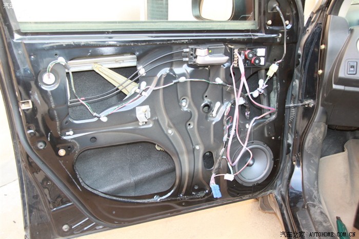 原车的高低音喇叭是串联的,不同于后门喇叭只有两条线,前门的低音喇叭上接了4条线,两进两出,因为进出线和其他线都包在一起,要区分的话,有表的量一下,没表的可以两条两条的接喇叭上,给点音乐,没声的是上高音的那对线。左右门的喇叭线颜色不一样,左门的线的颜色是粉色和蓝色,粉色是正极。