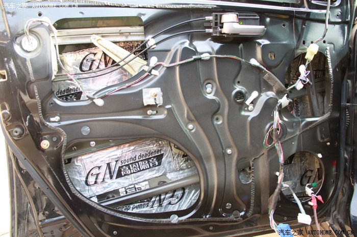 把门里面清理干净,开始贴第一层止震板,没什么技术难度,贴大块,补小块。这层贴完了,再敲门声音已经不一样了,关门声音也低沉了。