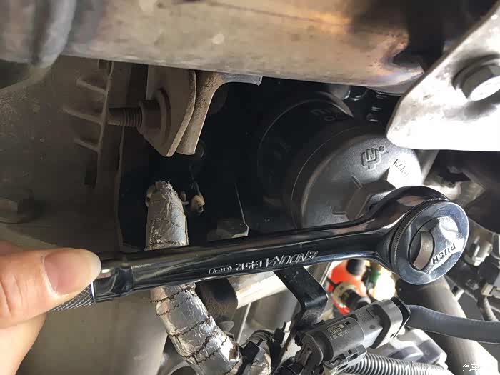 放油完毕后卸下机油滤清器,这里要用到专用的机油格扳手,淘宝买的,规格(902),配合棘轮扳手从下部操作。