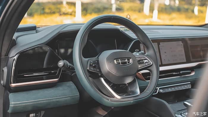 星越L的内饰高级感非常到位,车内用了很多的高档材质,除了大量的软包,中控台以及座椅还用了较多翻毛皮的材质,触感很舒服,皮质的方向盘手感细腻柔软,在颜色搭配方面,这个绿色显得很有格调的感觉。