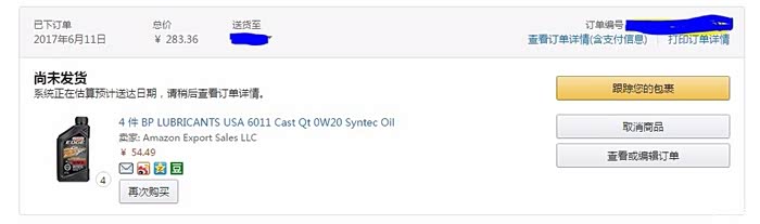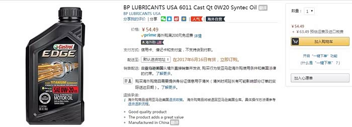 发现亚马逊海外购有黑嘉0w-20这款油,开通体验prime账户还可以满200免邮费,但是税费不免,30%的税,真黑!于是就买了4瓶美亚发货的黑嘉0w-20,并且再在狗东买两瓶全球购自营的黑嘉0w-20,通过对比看看狗东到底可买假货!现在直播开始,亚马逊海外购已下单,估计1周左右才到货,狗东等到明天价格秒杀价再下单,持续直播ing。。。