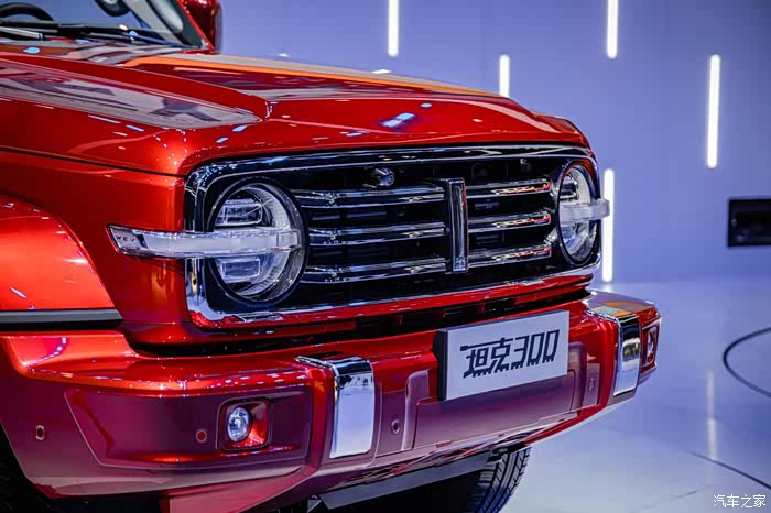 前脸部分,坦克300采用了大尺寸三横幅式进气格栅与圆形大灯相连,经典复古的气息扑面而来,夜间行驶在路上打开大灯绝对非常具有辨识度。