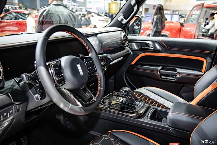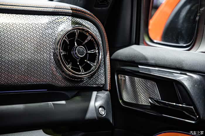 内饰方面多处搭配橙色缝纹线,涡轮式的空调出风口和圆形功能旋钮,以及双12.3英寸全液晶仪表+中控液晶屏组成的一体式连屏都充分展现出了内饰的科技感。