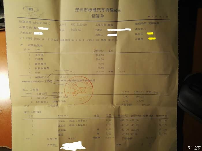 今天保养共花费980元,机油4+1(458+117),风格97.5,机油格112,工时费共196.2(9折后的价格),机油大概用了4.6升多。机油比较贵,以前的高尔夫用黄喜力HX6全合成5W-40才400左右。