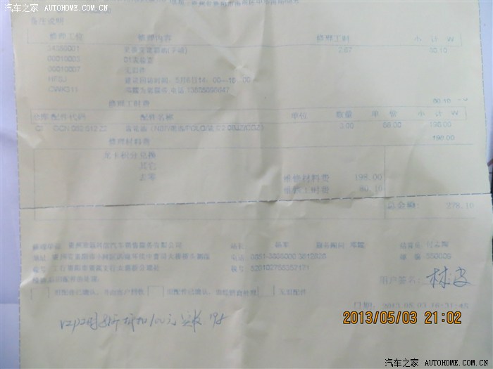 最后附上费用清单 :材料费 3*66 =198 工时费 80.1元(用VIP卡工时卷抵扣100工时费)