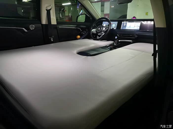 一直以来,我们进行床车出游时,基本都是将后排座椅放倒,接着把后备箱的行李一股脑地搬到前排去,借助后备箱和后座的空间来拼凑成一张床。后排座位的区域还算比较宽敞,其宽度大约有 1.5 米,然而当躺下去后,后备箱较窄的那个部分就显得格外窄了,仅仅只有一米宽,这样的宽度对于两个人来说睡起来着实不太舒服。我也常常看到其他车型的车友们对一二排车厢进行改装,在车内垫上充气拉丝床垫,从而打造出一个令人羡慕的大床车。可无奈的是,我们的岚图 free 由于前排座位无法实现 180 度放平,所以我一直只能羡慕其他车友拥有那样的大床房车。