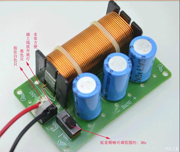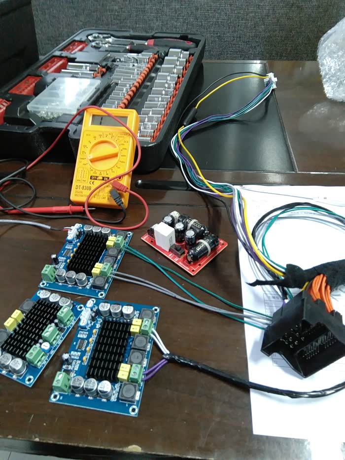 好了,目前为止大致的头绪已经理清楚了,将原车的前后门音频输出分别接功放模块,从前门功放后端并联一组音频线至低音分频器,经过分频后的信号再连接至单独的功放模块,这样低音就有了
