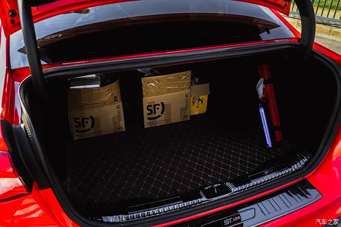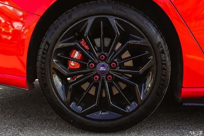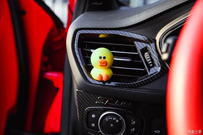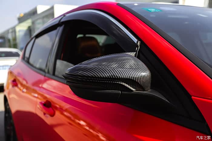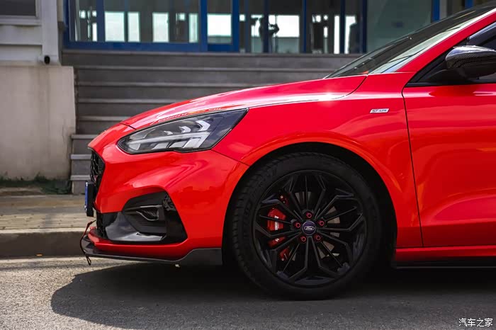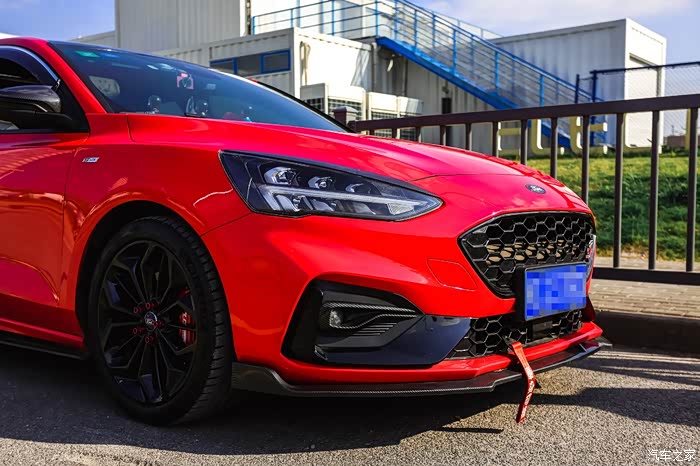 蜂窝状全黑前进气格栅、造型犀利的运动下包围和极具辨识度的ST Line专属车标,当然还有最漂亮的电音红车身