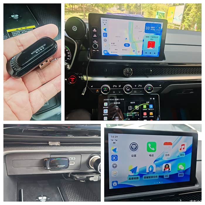 方案二:Carlife有线转无线各种盒子(hicar carplay carlife,根据自己的手机选择),我用的是物本魔盒有线carlife转无线carlife的盒子,见下图,连上手机后各种好用,完美利用原车大屏,高德和百度都带巡航、导航红绿灯读秒,但是接打电话的时候免提和蓝牙耳机很随意,没有规律可言,我平时习惯用蓝牙耳机,如果不用蓝牙耳机的话,可能会好一些。而且地图没有二指缩放功能,只能单点+-,同时需要手机投屏,个别型号手机会发热,脱离手机后无法使用。如果没有特殊要求,这个就够用了,还可以用这个放手机的音乐,感觉这个放出来的音乐比蓝牙放的更细腻更好听一些,这个设备价格在200左右。见下图